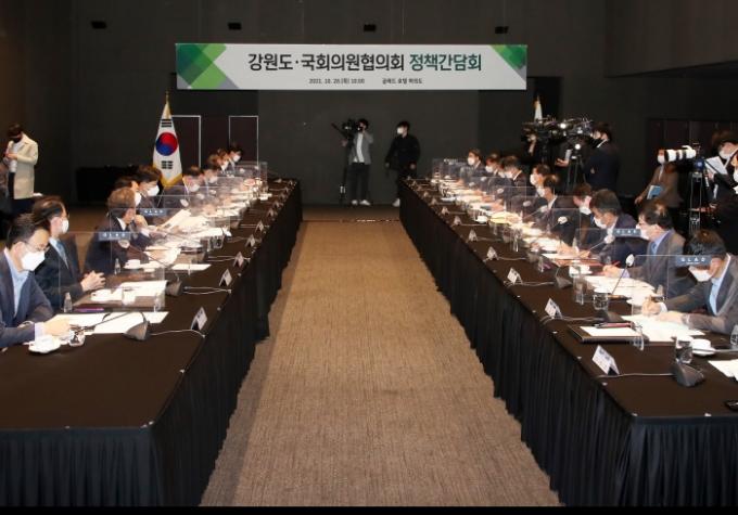 이날 간담회는 최문순 강원도지사, 곽도영 강원도의장, 권성동 국회의원협의회장을 비롯해 지역구 국회의원들이 참석한 가운데 내년도 정부예산안의 국회 심의를 앞두고 지역 현안 사업에 대한 국비 확보와 지역 입법과제 해결을 위한 심도 있는 논의를 위해 마련됐다.
