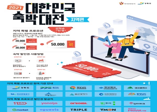 본 프로모션은 강원도를 비롯해 경기·인천·세종·충남·경북·경남·울산·부산·대구가 동참했다. 총 7만여 개의 숙박시설에 총 8만 장의 할인쿠폰(약 40억 원 규모)을 지원한다.