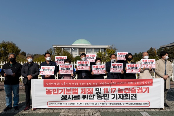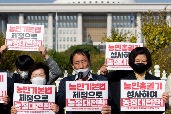 전국농민회총연맹 관계자들이 2일 국회 앞에서 '농민기본법 제정 및 11.17 농민총궐기' 기자회견을 하고 있다.