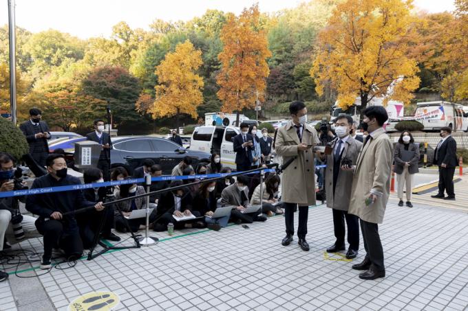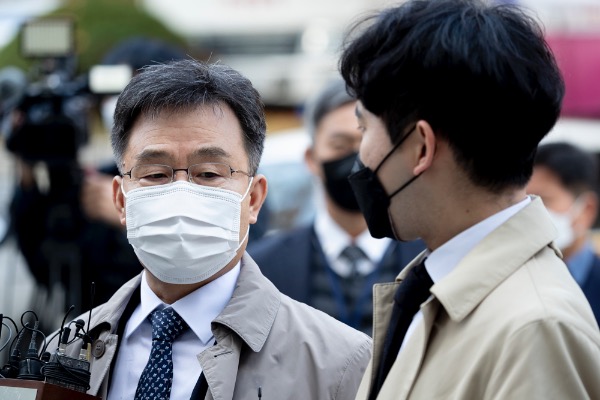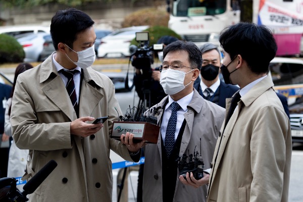 대장동 개발 특혜 의혹의 핵심인물인 화천대유자산관리 대주주 김만배 씨가 3일 서울중앙지법 구속 전 피의자심문에 출석하며 취재진 질문에 답하고 있다.