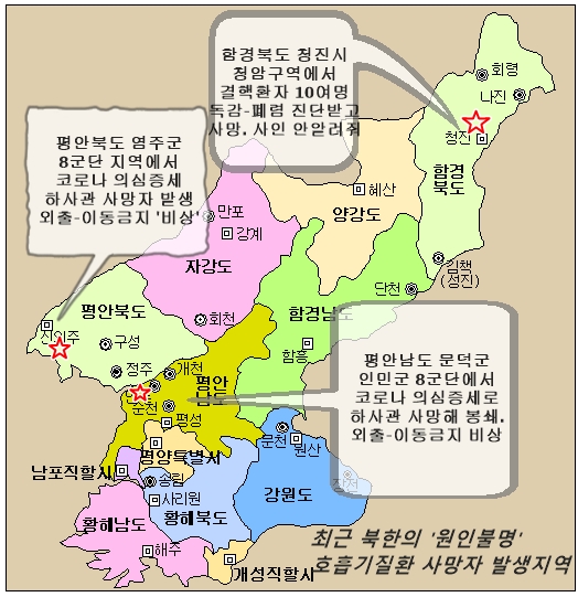 식량난과 강제노역보다 심각한 것은 최근 지방에서 신종 코로나바이러스 감염증(코로나19) 확진자와 그로 인한 사망이 의심되는 호흡기질환자들이 발생했다는 보도가 잇따르고 있는 점이다.