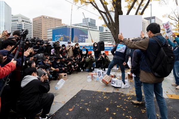 전국건설노동조합 관계자들이 9일 서울 정부서울청사 앞에서 '건설 기계 요소수 폭등 사태 정부대책 촉구' 기자회견 중 '요소수 포장 박스를 걷어차는 퍼포먼스'를 하고 있다.
