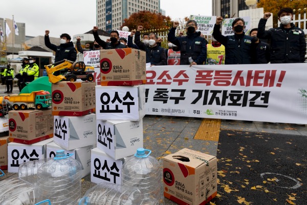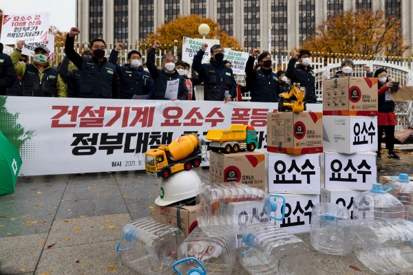 전국건설노동조합 관계자들이 9일 서울 세종로 정부서울청사 앞에서 '건설 기계 요소수 폭등 사태 정부대책 촉구' 기자회견 중 구호를 외치고 있다.