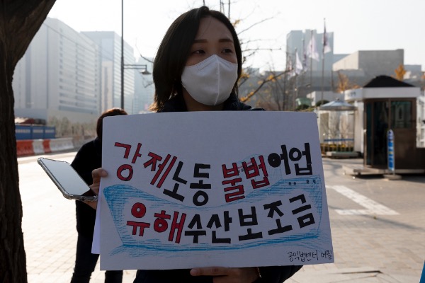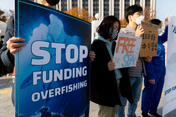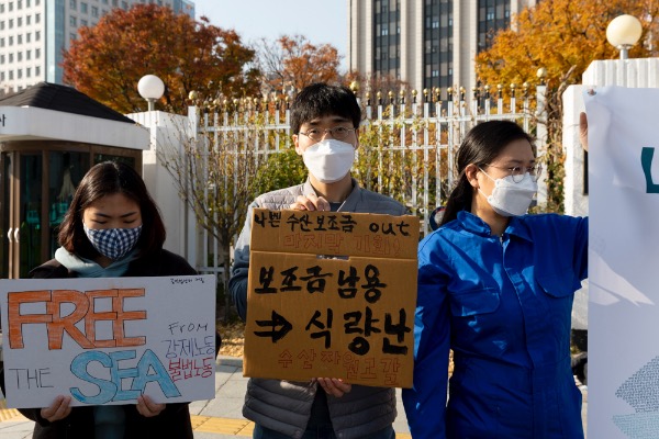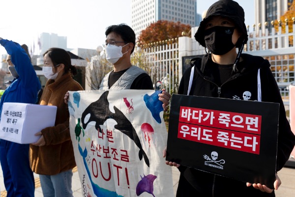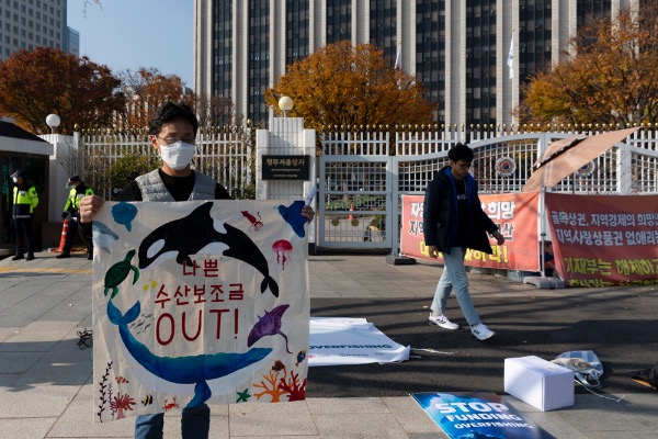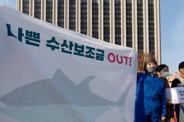 환경운동연합 등 시민단체가 15일 서울 종로구 정부서울청사 앞에서 'WTO 수산보조금 폐지 지지안 촉구' 기자회견을 하고 있다.