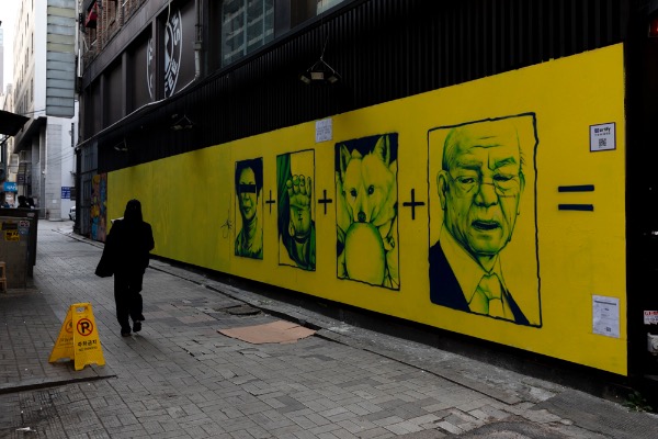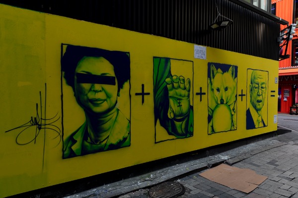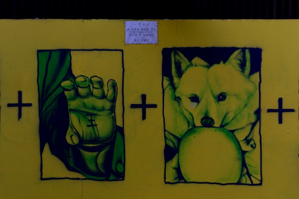 15일 서울 종로구 관철동의 한 중고서점 외벽에 등장한 국민의힘 윤석열 대선 후보 관련 벽화. '쥴리 벽화'로 논란이 됐던, 바로 그 자리다. 이번엔 윤 후보의 손바닥 '王'자, '개 사과', '전두환' 모습을 그렸다. 그래피티 작가 '닌볼트'가 지난 11일부터 이틀간 그린 것이라고 한다.