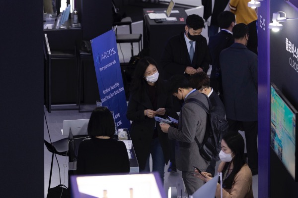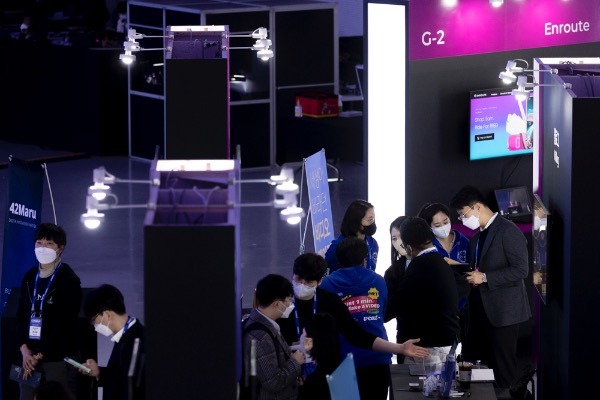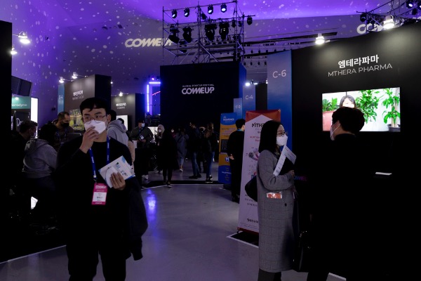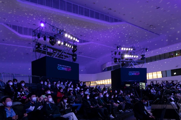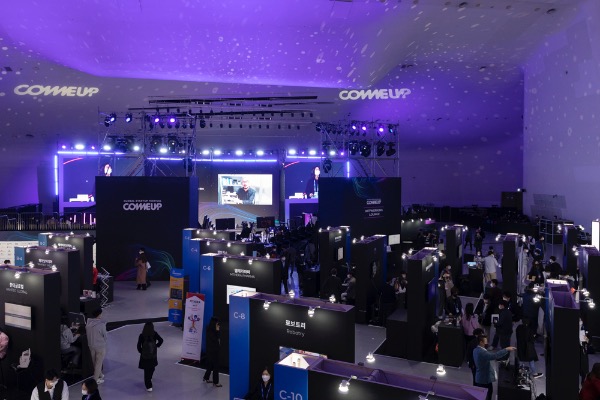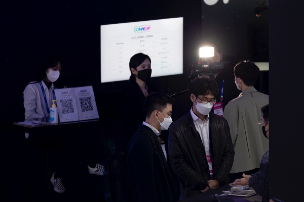 아시아 대표적 스타트업 행사인 '컴업2021'이 17일 서울 동대문디자인플라자에서 개막했다. 관람객들이 마스크를 쓴채 강연을 듣고 있다.