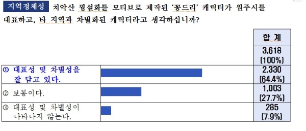 설문에 참여한 3618명 중 시민 대부분(응답자 중 84%)이 원주시 캐릭터 '꽁드리'에 대해 알고 있는 것으로 나타났다. 또한, 응답자의 64%가 '꽁드리'가 타 지역과 차별화된 원주의 대표성을 잘 담고 있다고 응답했다.