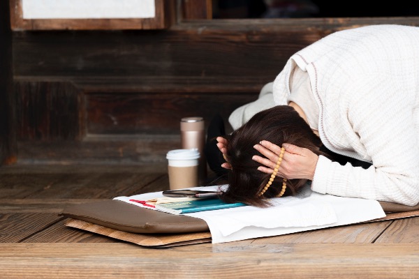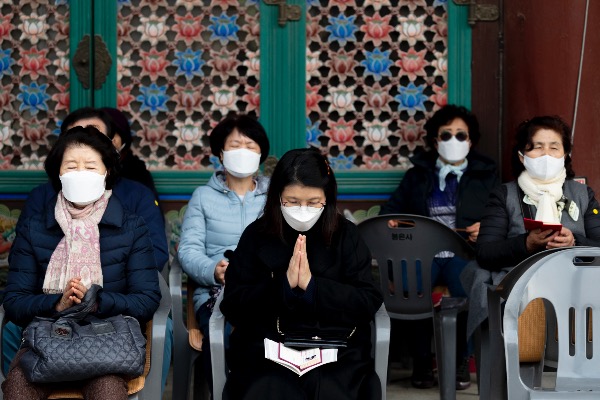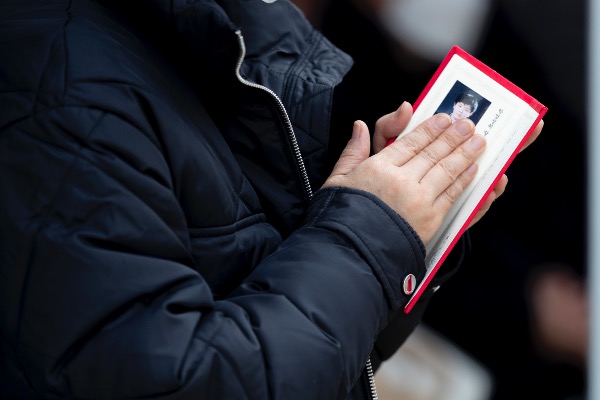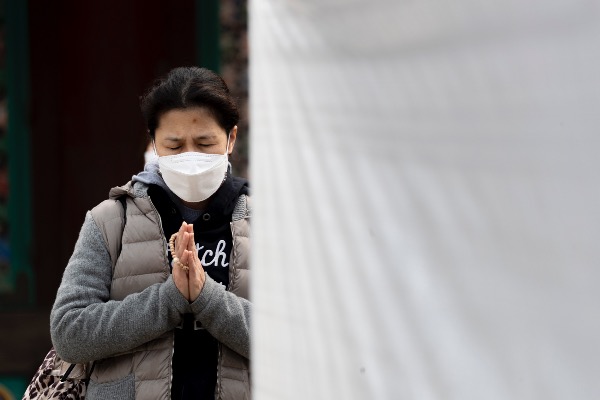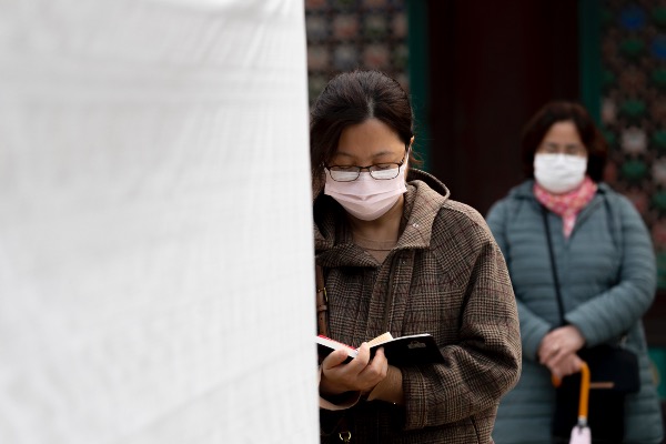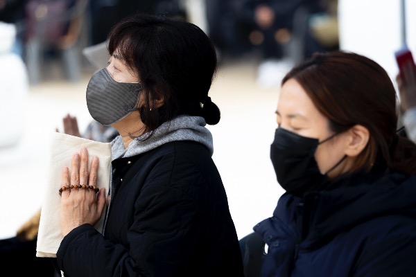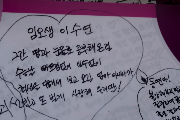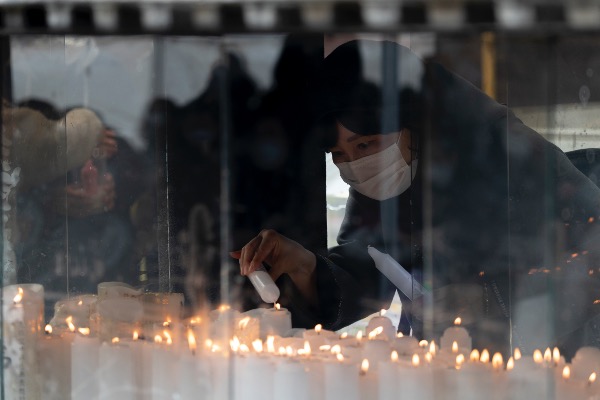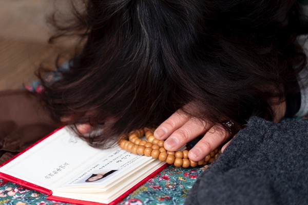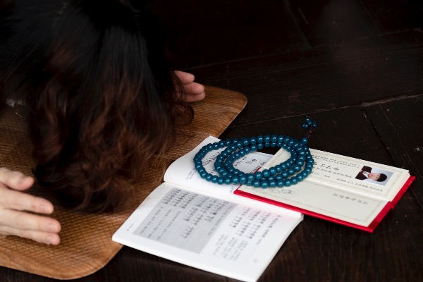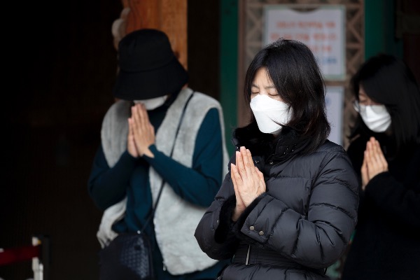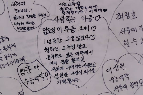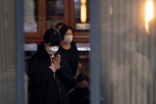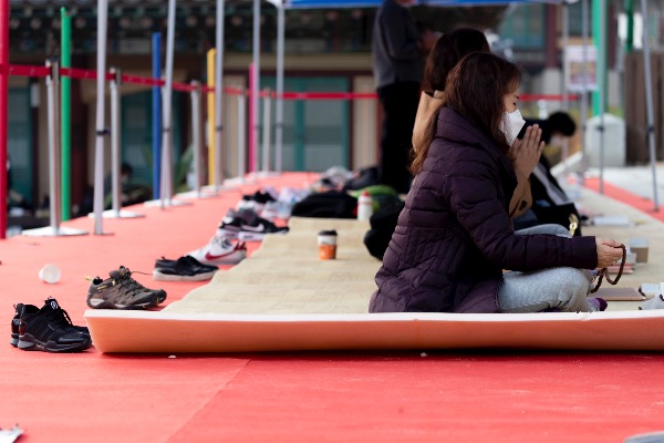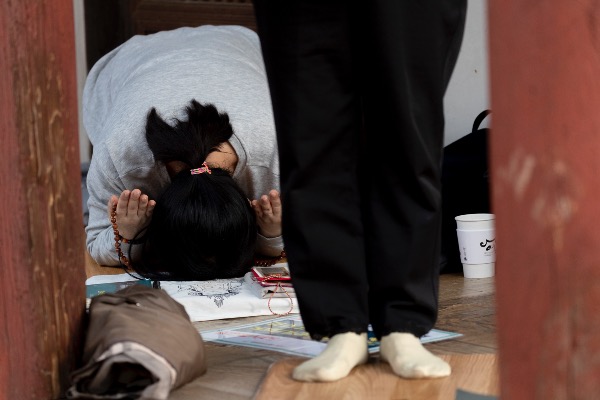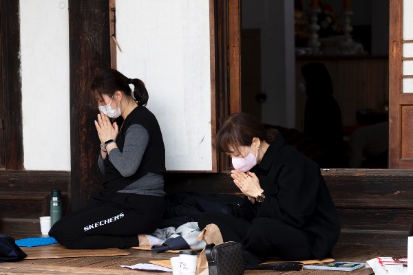 2022학년도 대학수학능력시험일인 18일 서울 강남구 봉은사에서 한 학부모가 자녀 사진을 앞에 두고 기도하고 있다.