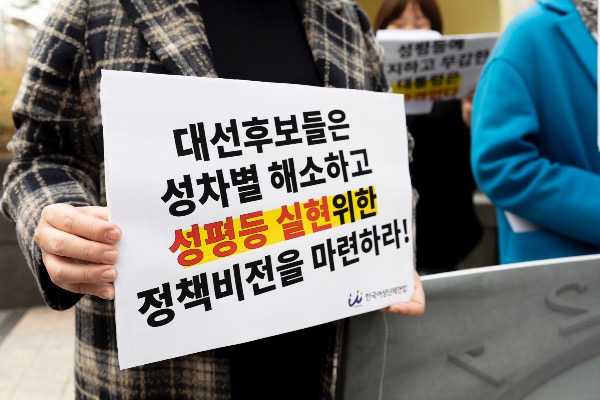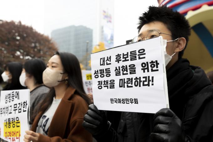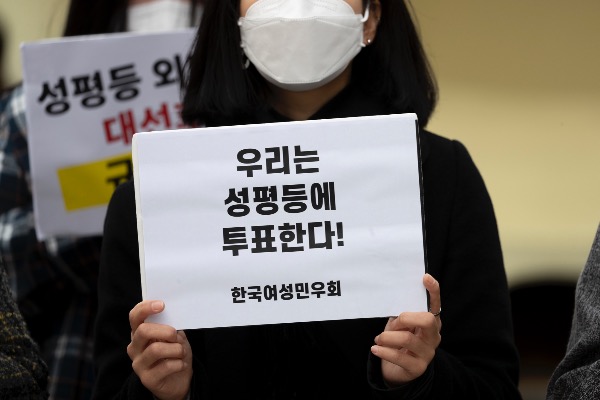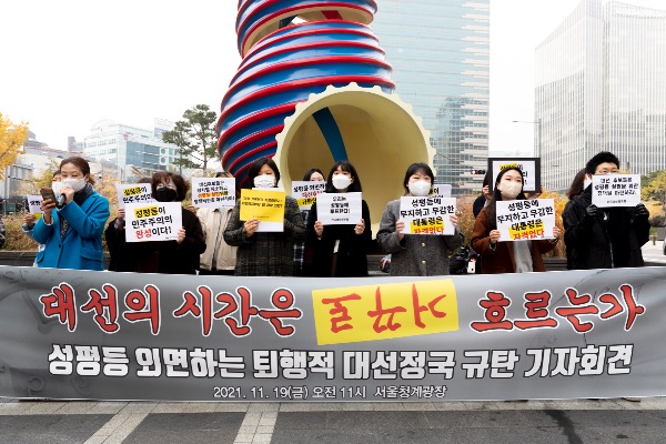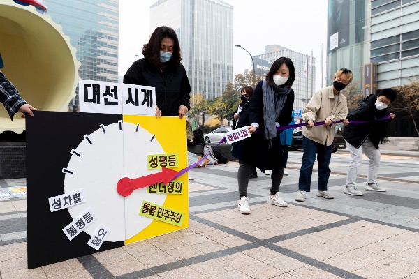 한국여성단체연합 등 시민단체가 19일 서울 청계광장에서 '성평등 외면하는 퇴행적 대선정국 규탄' 기자회견 중 퍼포먼스를 하고 있다.
