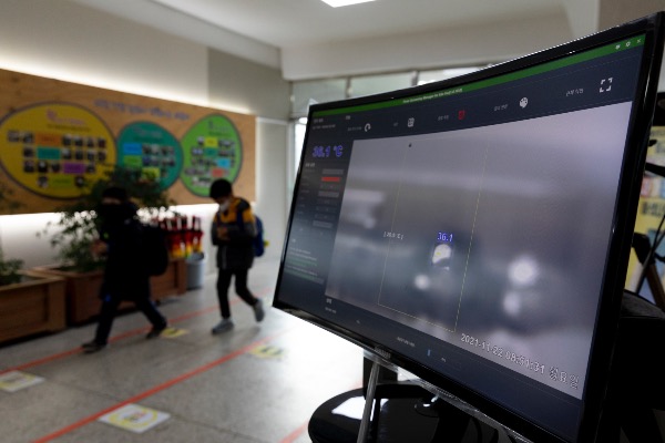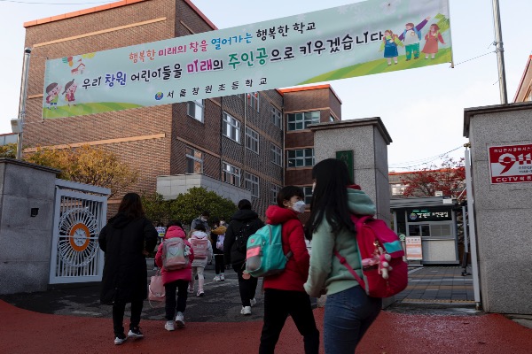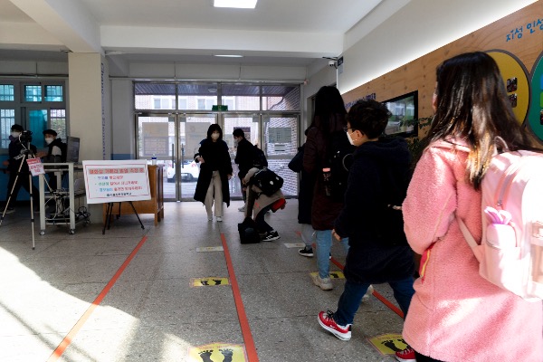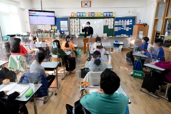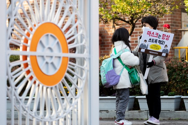 코로나19 사태 이후 1년7개월 여만에 전국의 유치원과 초·중·고교가 전면 등교를 시작한 22일 오전 서울 도봉구 창원초등학교에서 학생들이 등교하고 있다.