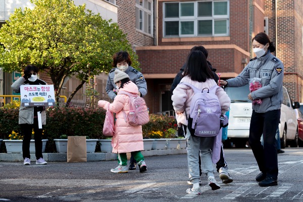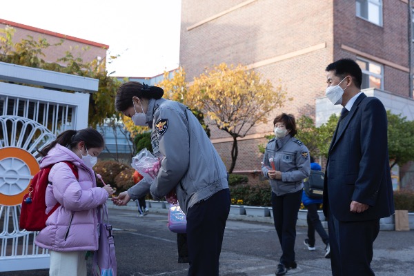 코로나19 사태 이후 2년여 만에 전국의 유치원과 초·중·고교가 전면 등교를 시작한 22일 오전 서울 도봉구 창원초등학교에서 도봉경찰서 관계자들이 학교폭력 예방 연필을 나눠주고 있다.