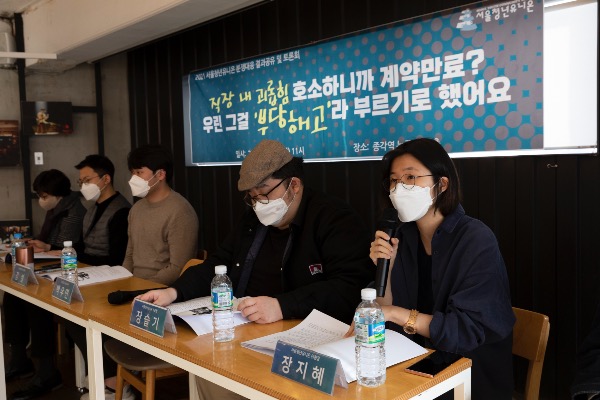 서울청년유니온이 23일 서울 종로구 누구나에서 '서울바이오허브 부당해고' 관련 기자회견을 하고 있다.
