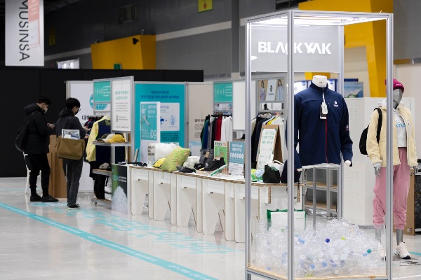 23일 서울 서초구 양재aT센터 '디지털패션소스2021'를 찾은 시민들이 페트병으로 만든 의류를 보고 있다.