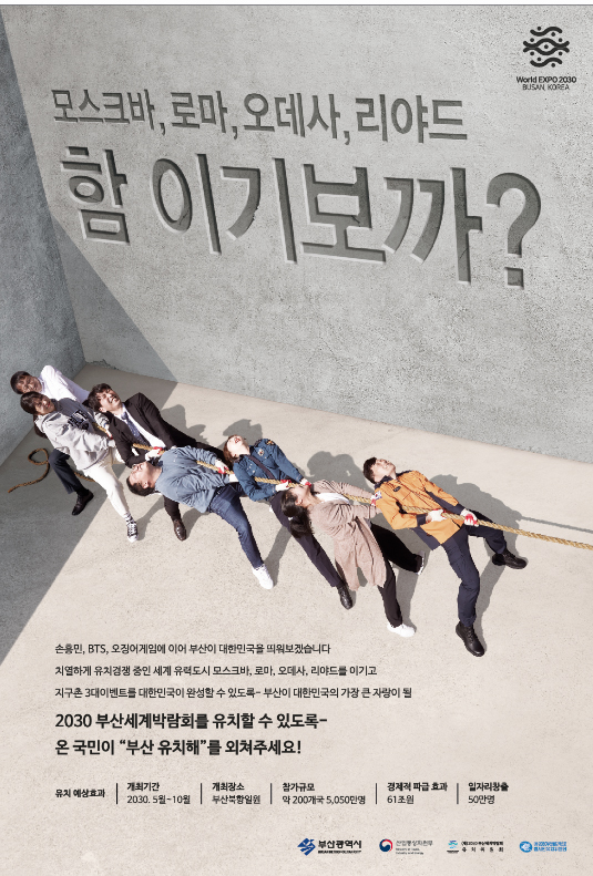 지난 23일부터 도시철도 전 역사와 열차 안팎에 부산세계박람회 유치 공식 홍보 포스터를 붙였고, 시내 전체 공동주택이나 공공기관 게시판에도 올해 말까지 홍보 포스터를 게시할 예정이다.