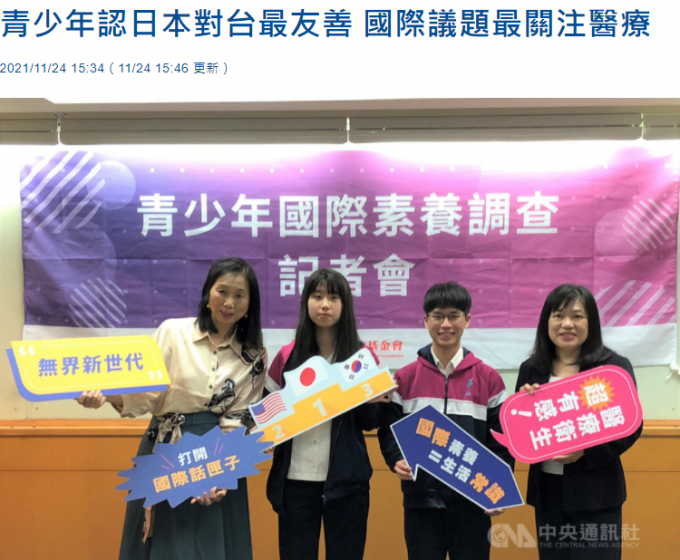 대만의 한 문화교육재단(金車文敎基金會)이 대만 고등학생 1만1555명을 대상으로 진행한 '청소년 국제 문해력 설문조사' 결과, 청소년의 85%가 대만에 가장 우호적인 국가로 '일본'을 꼽았다고 대만 중앙통신(中央通信)이 24일 보도했다. 두 번째로 꼽은 우호국가는 미국(71%)이었으며 한국(35%)은 그보다 상당한 차이가 있는 세번째 우호국으로 꼽혔다.