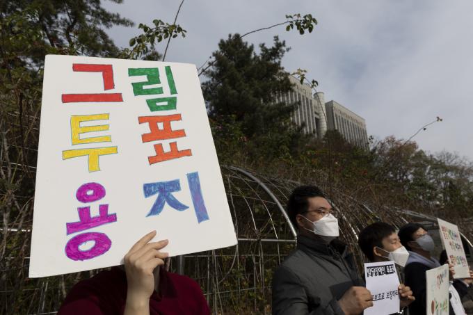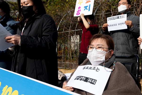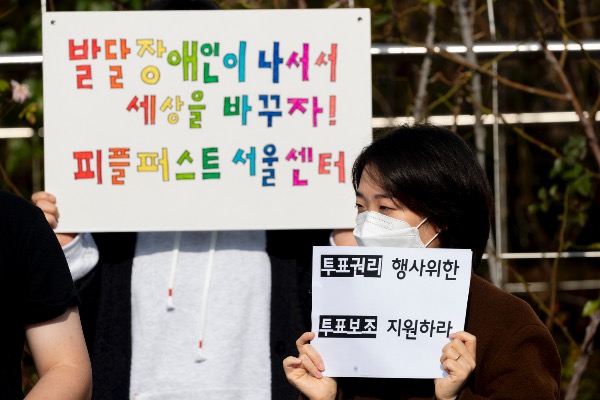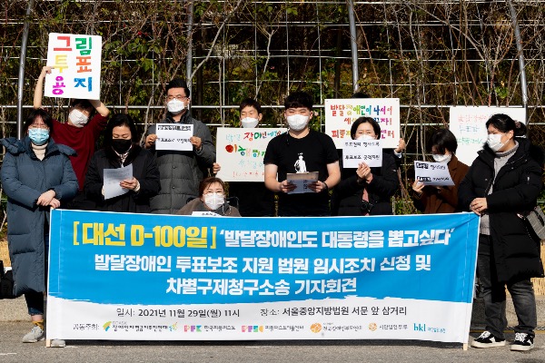 장애인차별금지추친연대, 전국장애인부모연대 등 시민단체가 29일 서울중앙지방법원 앞에서 '대선 100일, 발달장애인 투표보조 지원 법원 임시조치 신청 및 차별구제청구 소송' 기자회견을 하고 있다.