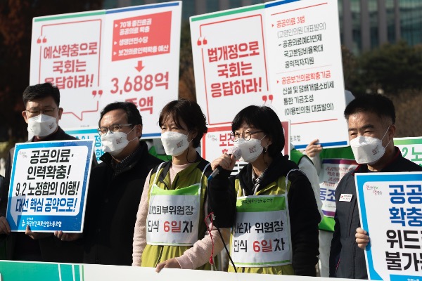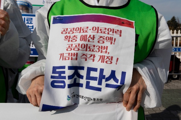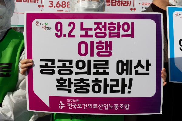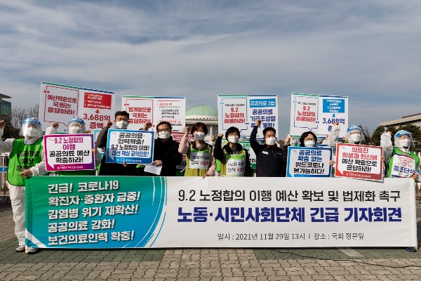 전국보건의료산업노동조합 조합원들이 29일 서울 여의도 국회의사당 앞에서 열린 '9.2 노정합의 이행 예산 확보 및 법제화 촉구 노동·시민사회단체 긴급 기자회견' 중 구호를 외치고 있다.