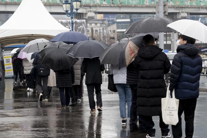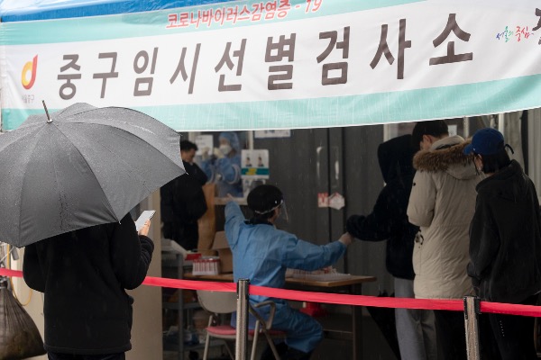 30일 오전 서울역 코로나19 임시선별진료소에서 시민들이 검사를 기다리고 있다. 이날 0시 기준 코로나19 신규 확진자는 3032명이다.