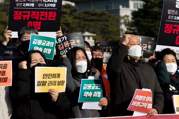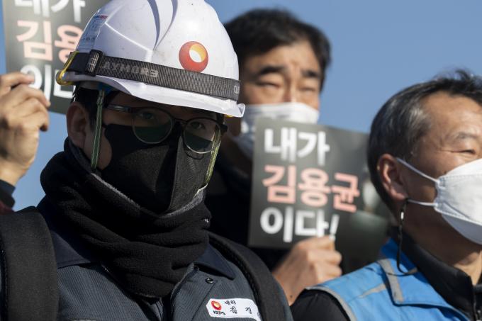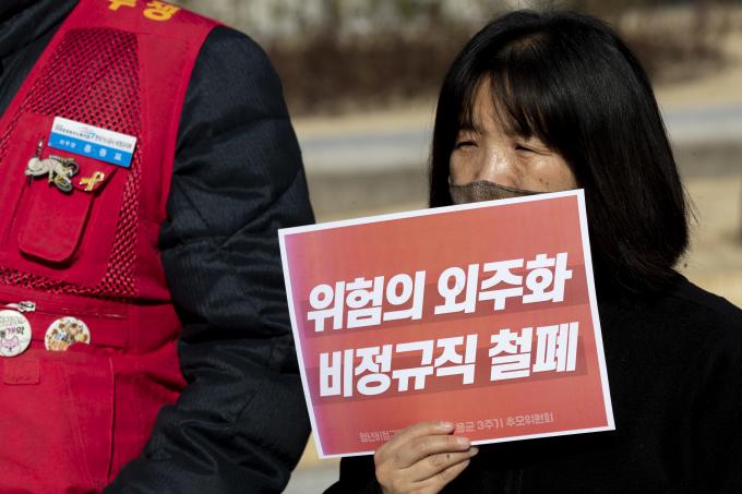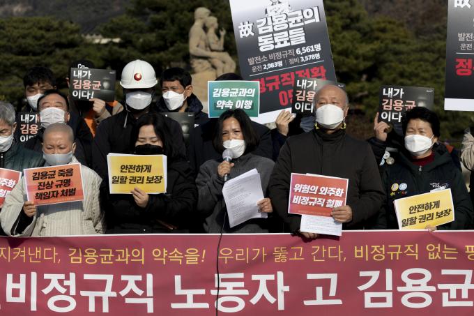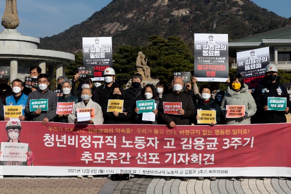고 김용균씨 어머니 김미숙 씨가 6일 서울 종로구 청와대 앞에서 고(故) 김용균 3주기 추모주간 선포 기자회견을 하고 있다.