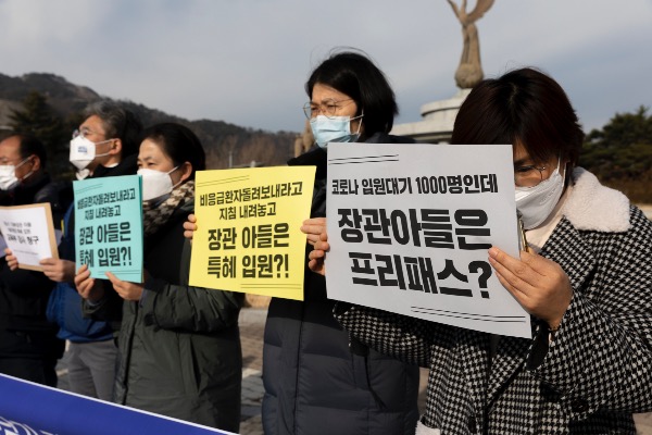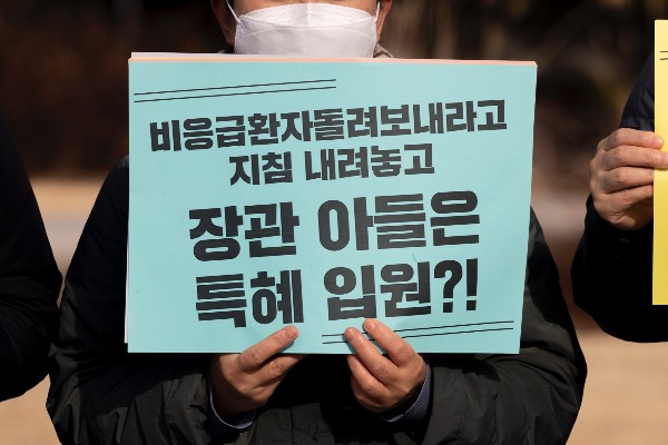 이들은 "코로나 신규 확진자 수가 7000명을 넘고 병실도 부족한 상황이다. 그런데 지난 2일 언론 보도를 보면 홍 장관은 당시 아들의 증상에 대한 걱정이 커 평소 친한 김연수 병원장에 여쭙는 전화 통화를 했고, 남아 있는 병실을 사용한 것일 뿐이라고 했다. 이는 고위 공직자가 특권의식에 사로잡혀 사태의 심각성을 전혀 이해하지 못하고 있는 것이다"라고 규탄했다.