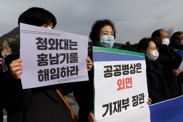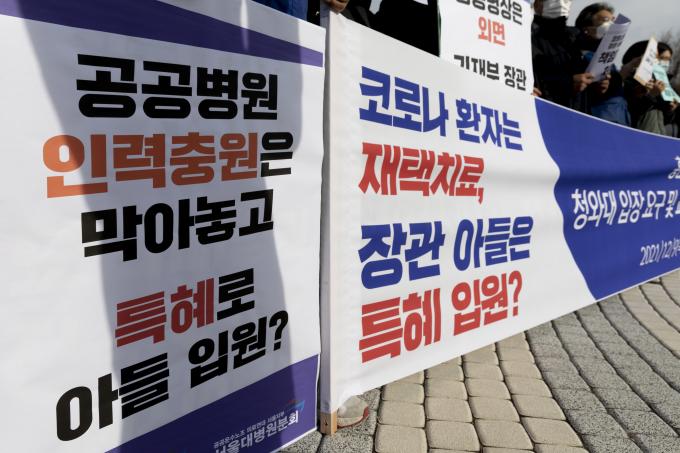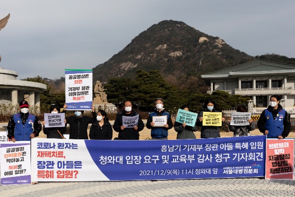공공운수노조 의료연대본부 서울대병원분회가 9일 서울 종로구 청와대 앞에서 '홍남기 기재부 장관 아들 특혜 입원, 청와대 입장 요구 및 교육부 감사 청구' 기자회견을 하고 있다.