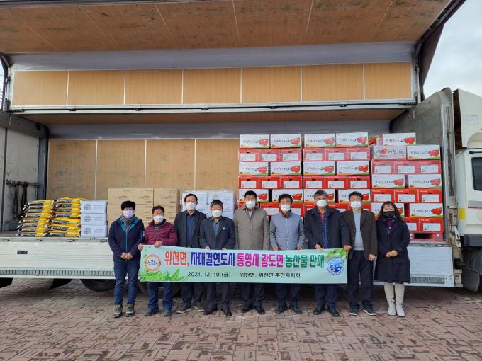위천면 주민자치회 임원들은 지난달 12일 통영시 광도면을 찾아 농특산물 홍보와 함께 주문을 받은 뒤 이날 차량으로 배송했다.