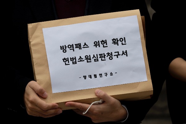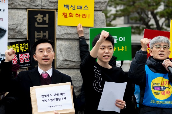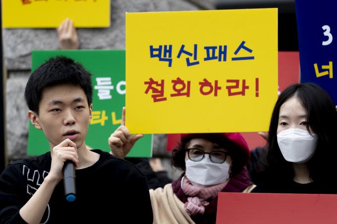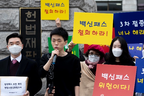 유튜브 채널 '양대림연구소'를 운영하는 고등학교 3학년 양대림 군이 10일 서울 종로구 헌법재판소 앞에서 '방역패스 위헌 확인 헌법소원심판 청구' 관련 기자회견을 하고 있다.