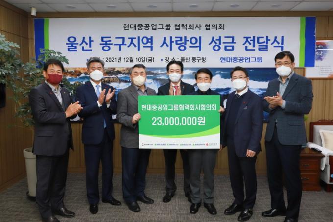 현대중공업과 현대미포조선, 현대일렉트릭, 현대건설기계 협력회사협의회는 10일 울산 동구청에서 '사랑의 성금 전달식'을 갖고, 2300만 원의 성금을 기탁했다.