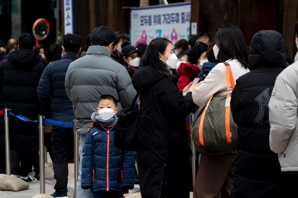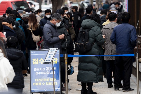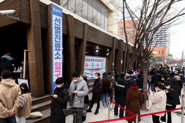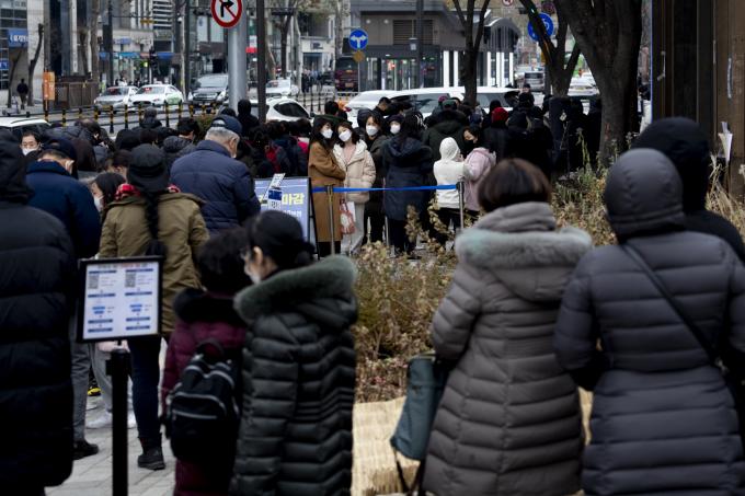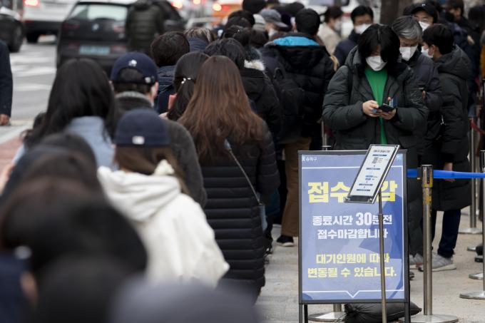 코로나19 위중증 환자가 900명을 넘은 14일 서울 송파구 선별진료소를 찾은 시민들이 검사 받기 위해 줄 서 있다. 0시 기준 코로나19 신규 확진자는 5567명, 입원 중인 위중증 환자는 906명, 사망자는 94명이다.