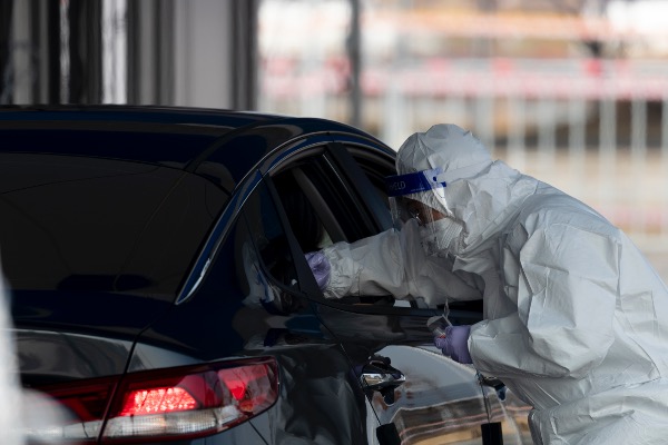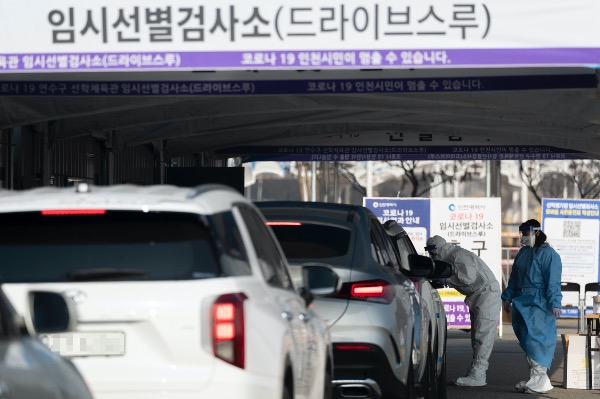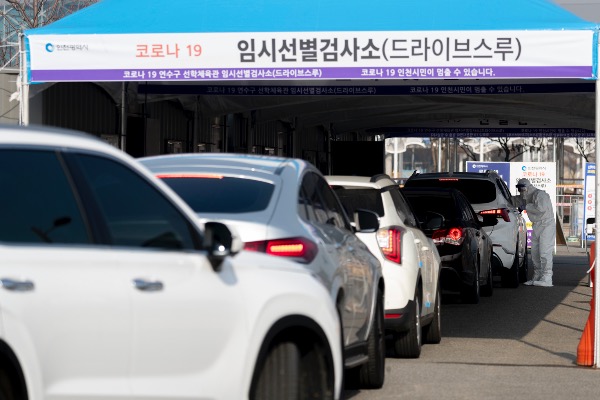 코로나19 확진자 급증으로 정부가 사회적 거리두기를 강화하기로 발표한 16일 인천 연수구 선학체육관 임시선별검사소에 검사 대기 차량이 이어지고 있다. 해당 검사소는 코로나19 확산세에 따라 지난 15일 추가로 마련됐다.