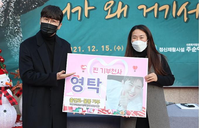 영탁은 사회적 소외계층인 장애인시설 '와로'와 '주순애원'을 방문해 출연료 전액 1000만 원씩을 전달하고 시설장애인들과 만남의 시간을 가졌다.