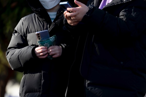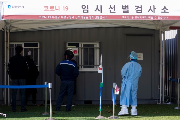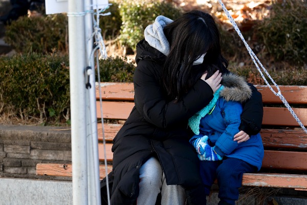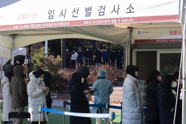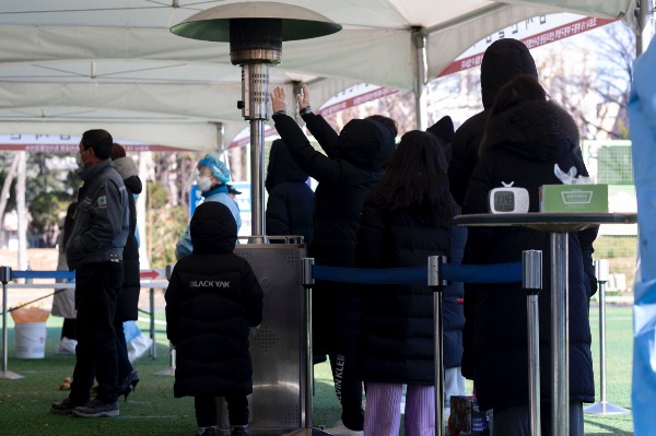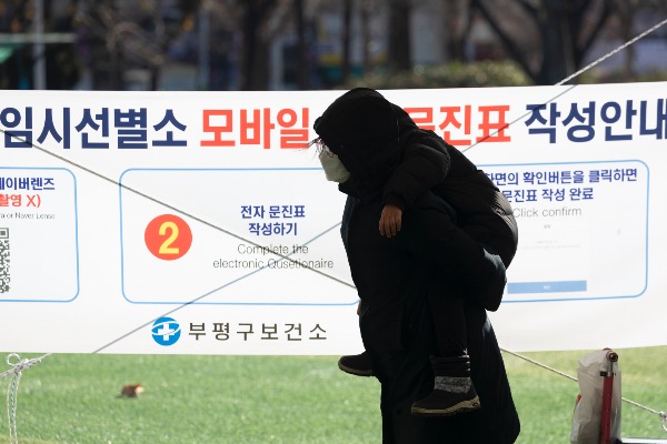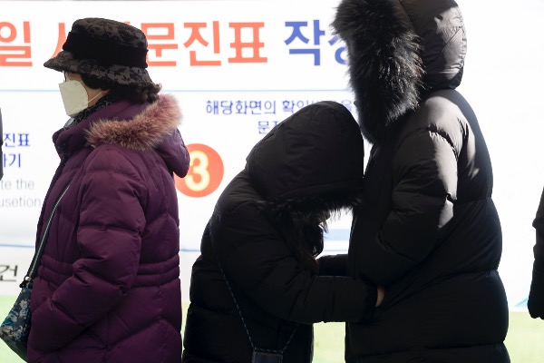 수도권 지역에 한파주의보가 내려진 17일 인천 부평구청 임시선별진료소에서 한 아이가 엄마의 외투 주머니에 손을 넣고 검사를 기다리고 있다.