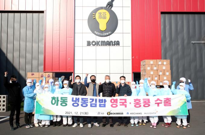 하동군은 21일 하동읍에 있는 복을만드는사람들(주) 사업장에서 윤상기 군수와 손두기 NH농협 하동군지부장 등이 참석한 참석한 가운데 냉동김밥의 영국 첫 수출 선적식을 열었다고 22일 밝혔다.