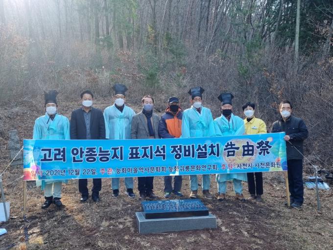 사천시 능화마을역사문화회(회장 구덕상)와 능화귀룡문화연구회(회장 구종효)는 22일 사남면 능화마을 꽃밭등에서 고려 안종능지의 표지석 내용을 정비하여 새로 세우고, 고유제를 봉행했다.