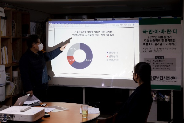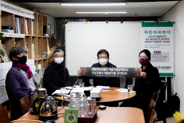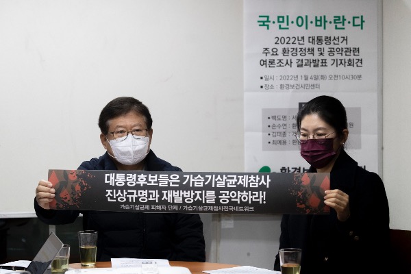 4일 서울 종로구 환경보건시민센터에서 '2022년 대통령 선거 주요 환경정책 및 공약관련 여론조사 결과발표' 기자회견 진행중 가습기살균제 피해 유족 김태종(왼쪽)씨와 환경보건시민센터 손수연 운영위원장이 손팻말을 들어 시위를 벌이고 있다.