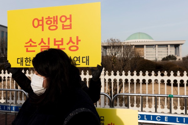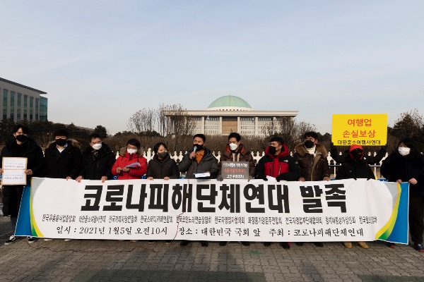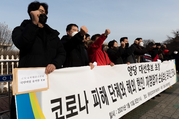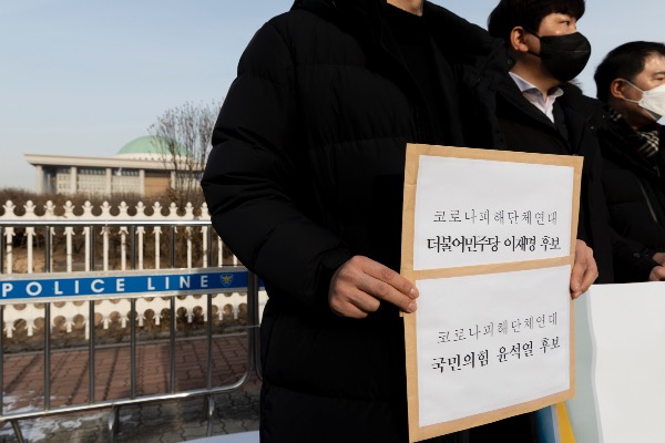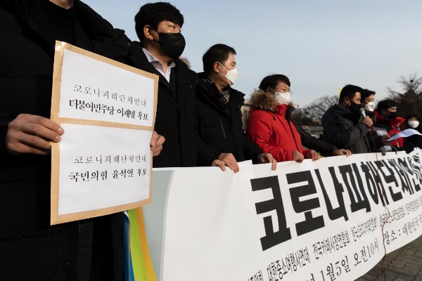 코로나피해단체연대가 5일 국회 앞에서 '코로나 피해 단체 연대 발족식과 양당 대선후보 초청, 자영업자 손실보상 온라인 간담회 제안' 기자회견을 하고 있다.