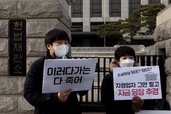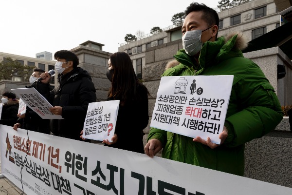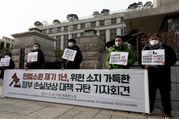 참여연대, 민변 민생경제위원회, 전국자영업자비대위 등이 5일 서울 종로구 헌법재판소 앞에서 '헌법소원 제기 1년, 위헌 소지 가득한 정부 손실보상 대책 규탄' 기자회견을 하고 있다.