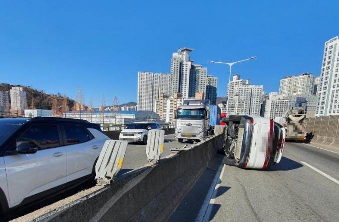 ▲ 6일 오전 11시 10분께 부산 동서고가도로에서 추돌사고로 넘어진 승합차 모습. [부산경찰청 제공] 이 사고로 승합차가 중앙분리대를 들이받고 전도되면서, 60대 운전자가 다쳐 병원으로 옮겨졌다. 사고 수습 과정에서 고가도로와 주변 램프에서 1시간 정도 큰 교통지체 현상이 빚어졌다.