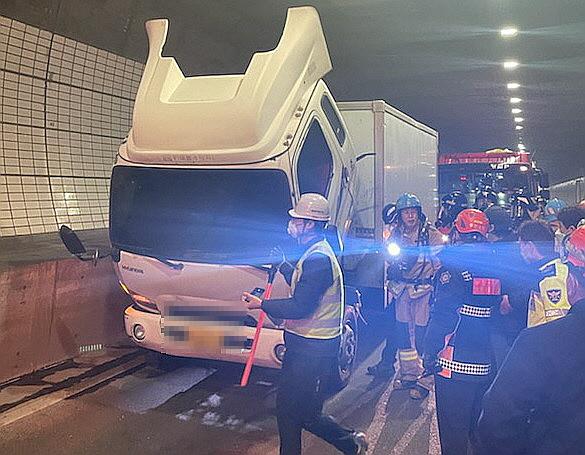 ▲ 10일 오전 4시 5분께 부산 부산진구 백양터널 안에서 엔진 연기 발생으로 멈춰선 트럭 모습. [부산경찰청 제공]