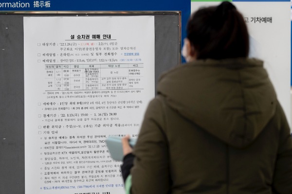 10일 서울역 매표소 앞에 '설 명절 승차권 비대면 예매 안내문'이 게시돼 있다. 한국철도공사는 설 명절 승차권 예매를 11일부터 13일까지 사흘간 온라인과 전화를 통해 비대면으로 진행한다. 11일 전 노선(전화·온라인) 경로·장애인, 12일 경부·경전·동해·대구·충북·경북·동해 남부선(온라인), 13일 호남·전라·강릉·장항·중앙·태백·영동·경춘선(온라인)을 대상으로 판매한다.