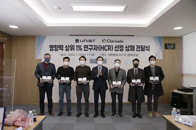 12일 오전 울산과기원 대학본부에서 개최된 상패 전달식에는 2021년 HCR에 선정된 UNIST 소속 교수 7명 중 6명이 참석했다.