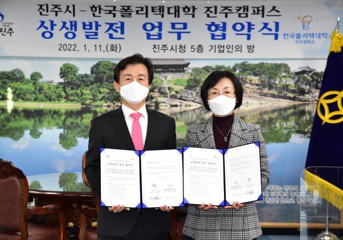 진주시와 한국폴리텍대학 진주캠퍼스는 11일 시청 5층 기업인의 방에서 상생발전을 위한 업무협약을 체결했다.