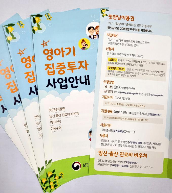 '첫 만남 이용권'은 올해 1월 1일부터 태어난 모든 출생아에게 국민행복카드 바우처로 1명당 200만 원을 지급하는 제도다. 예외적으로 사회복지시설 보호 영유아에게는 디딤씨앗 통장을 통해 현금으로 지급한다.
