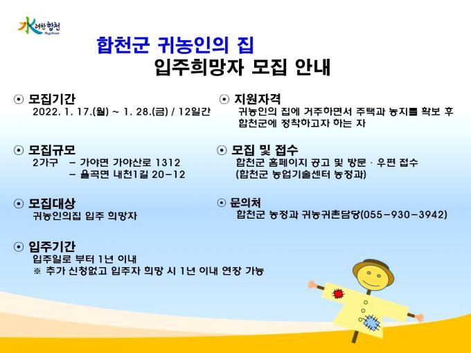 대상은 귀농인의 집에 거주하면서 주택과 농지를 확보한 후 합천군으로 정착하고자 하는 타 지역에 거주자다. 입주 가족이 많거나 귀농 교육 이수 실적이 많은 자를 우대한다.