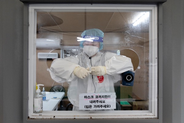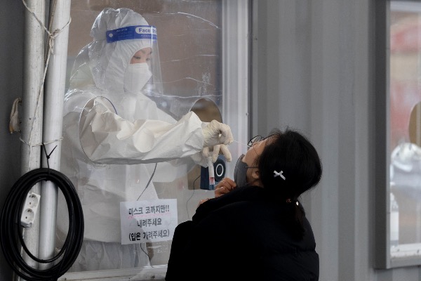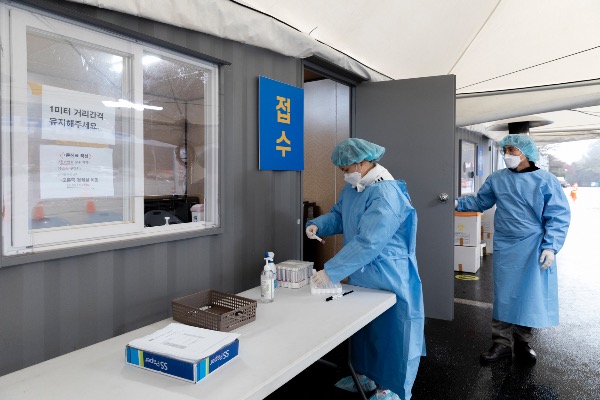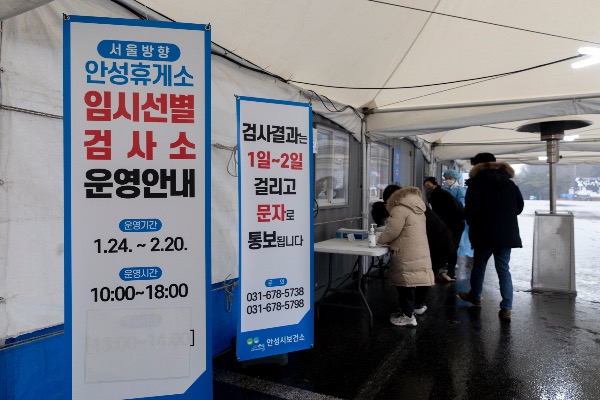 설 연휴를 나흘 앞둔 25일 경기 안성휴게소(경부선 서울방향)에 마련된 코로나19 선별진료소에서 시민들이 검사받고 있다. 경기도는 설 연휴를 앞두고 용인 휴게소(영동선 인천방향), 안성휴게소(경부선 서울방향), 이천 휴게소(중부선 하남방향) 3곳에 임시선별검사소를 설치, 4주간 운영한다.