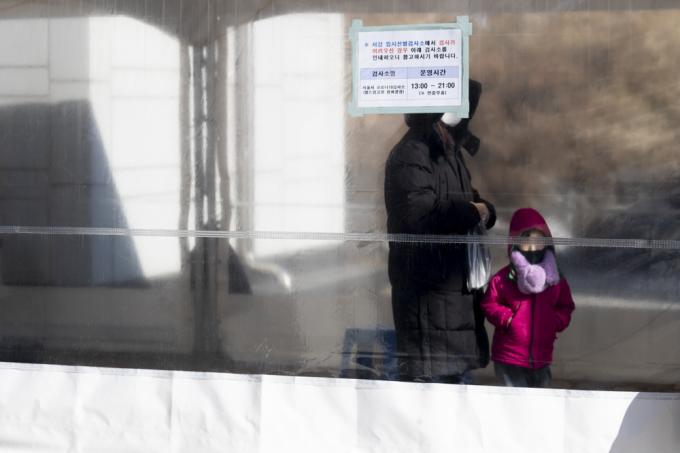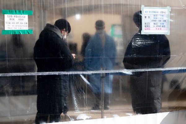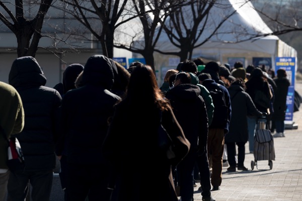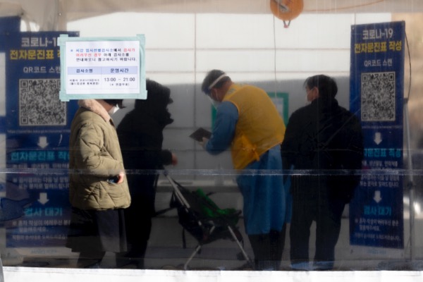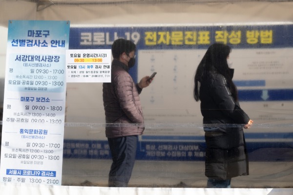 0시 기준 코로나19 신규 확진자가 1만6096명으로 확인된 28일 서울 마포구 서강대역사 임시선별검사소에서 시민들이 검사 받기 위해 기다리고 있다.