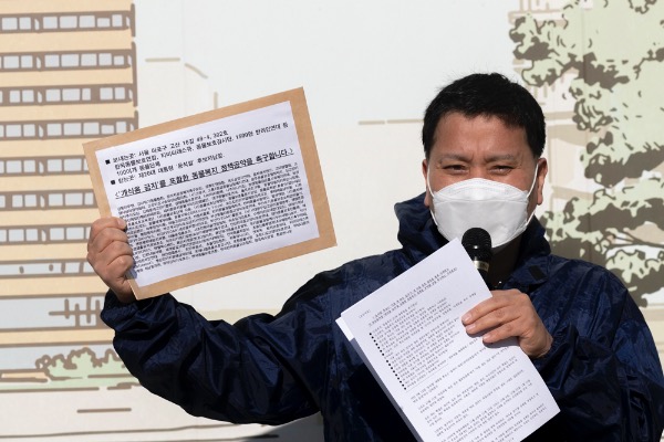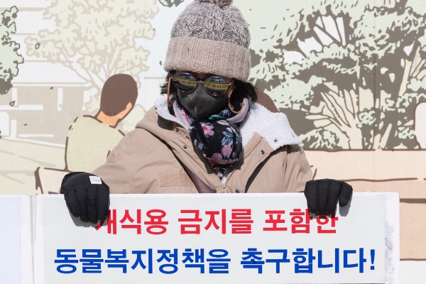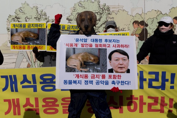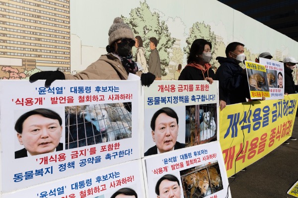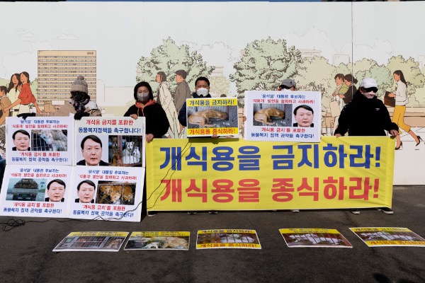 한국동물보호연합 등 동물단체 회원들이 10일 서울 종로구 이순신동상 앞에서 국민의힘 윤석열 대선 후보의 "식용 개는 따로 있다" 발언 철회와 '개식용 금지' 동물 복지 정책 공약을 촉구하는 기자회견을 하고 있다.