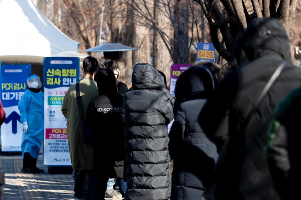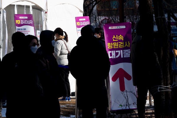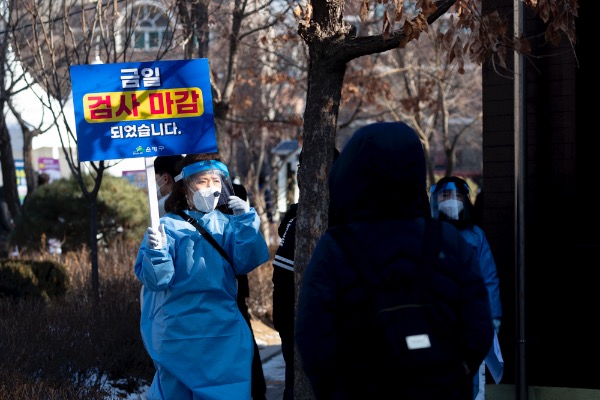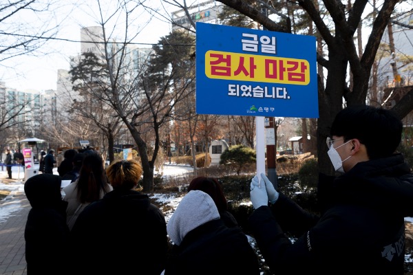 코로나19 신규 확진자가 0시 기준 2만 2907명으로 확인된 3일 서울 은평구 은평평화공원 임시선별검사소에서 한 의료인이 '오전 검사 마감'을 알리고 있다. "'금일 검사마감' 팻말뿐이어서 들고 있을 뿐 '오전 마감'을 알리는 것"이라고 이 관계자는 말했다.