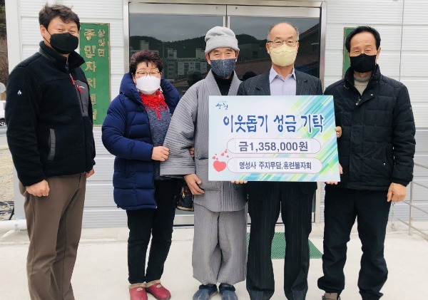산청군 신안면은 외고리 소재 명성사(주지스님 무담)와 명성사 홍련불자회(회장 이종근) 신도들이 성금 135만8000원을 기탁했다고 밝혔다. 기탁금은 경남사회복지공동모금회를 통해 어려운 이웃에 전달된다.