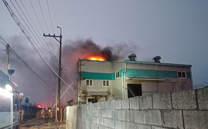 ▲ 12일 저녁 부산 강서구 가락대로 인근에 있는 공업사에서 발생한 화재 현장. [부산 강서소방서 제공]